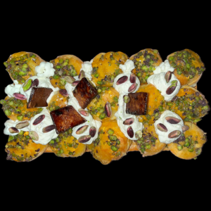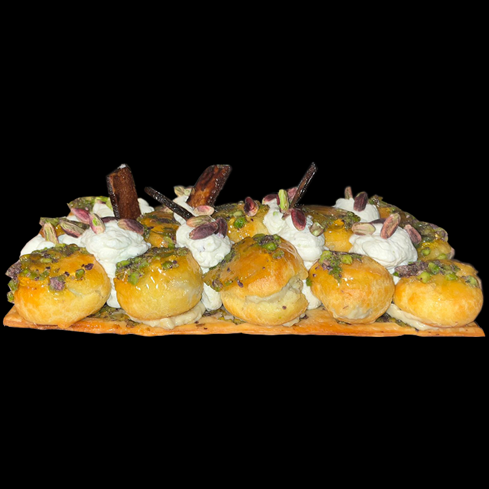 - Disposer les choux sur la pâte feuilletée cuite puis remplir les interstisse avec le chantilly. Ajouter les pistaches de Bronte AOP sur le dessus.